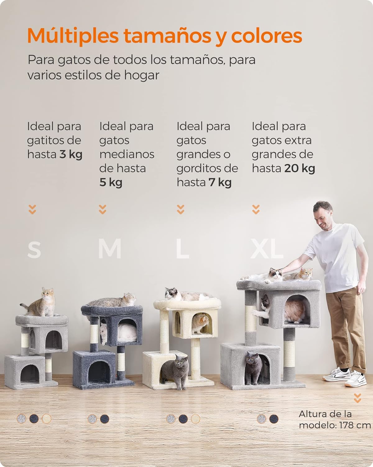 [Todo en uno: escalar, rascar y descansar] El diseño multinivel es ideal para que los gatitos suban y bajen fácilmente. Los 2 postes rascadores satisfacen sus instintos naturales y la plataforma superior es ideal para vigilar el exterior.