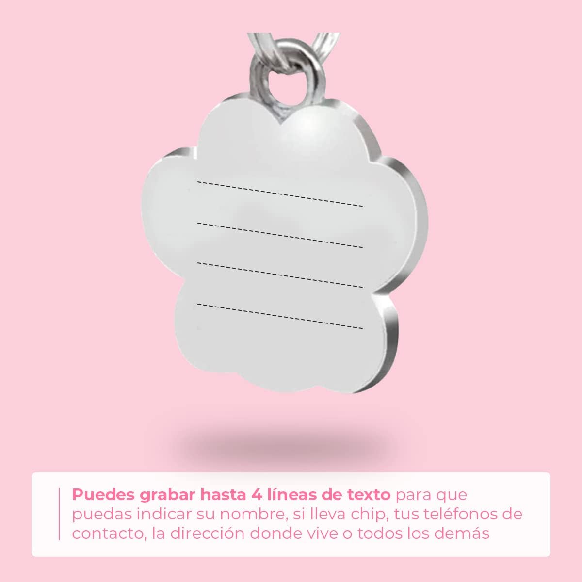 Chapa identificativa ideal para perros y gatos pequeños o medianos, con diseño brillante en forma de pata. Personalizable con hasta 4 líneas de texto grabados con láser, garantizando durabilidad. Incluye arandelas para una sujeción segura, y permite añadir información importante como el nombre o teléfono.