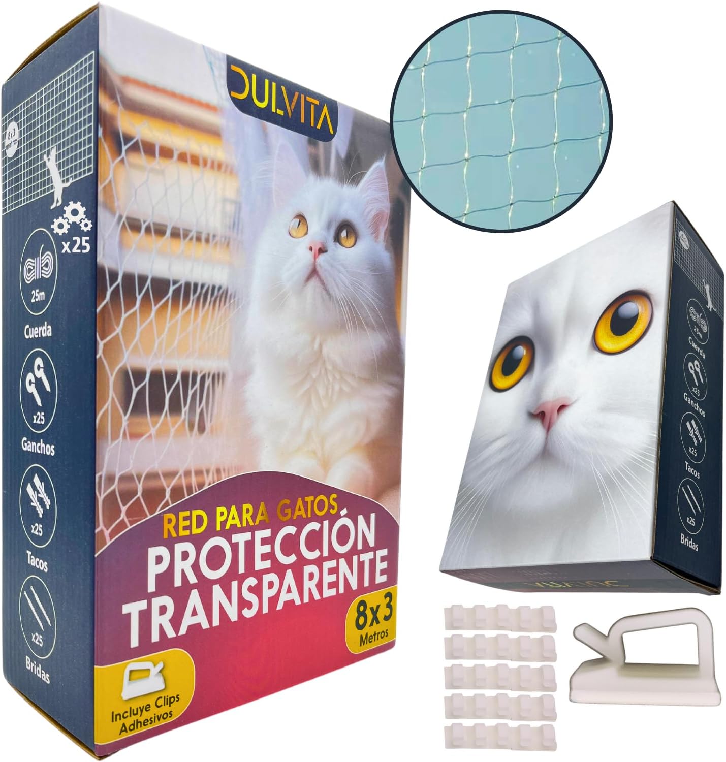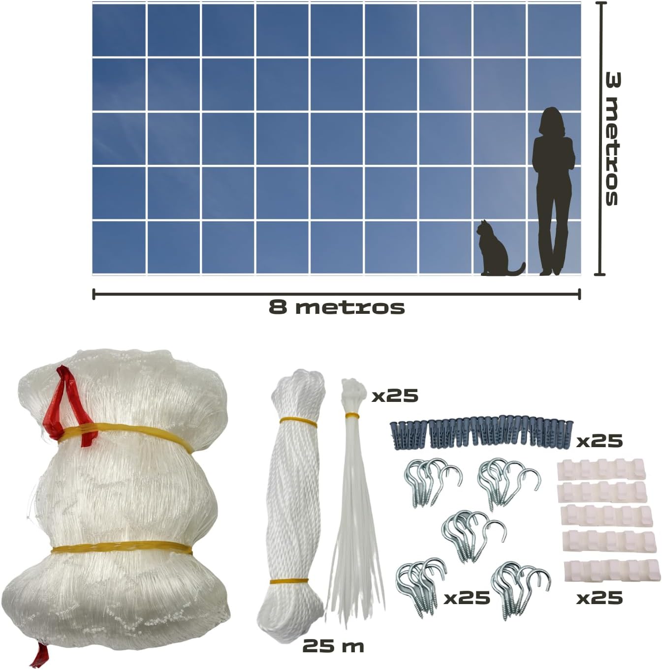 [INCLUYE] El pack DULVITA trae todo lo que necesitas: una red de nylon transparente de 8×3 m, 25 metros de cuerda fija, 25 tacos y ganchos, 25 bridas, un manual y 25 ganchos adhesivos para que no tengas que taladrar. ¡Es una opción muy práctica para mantener a tu gato seguro!